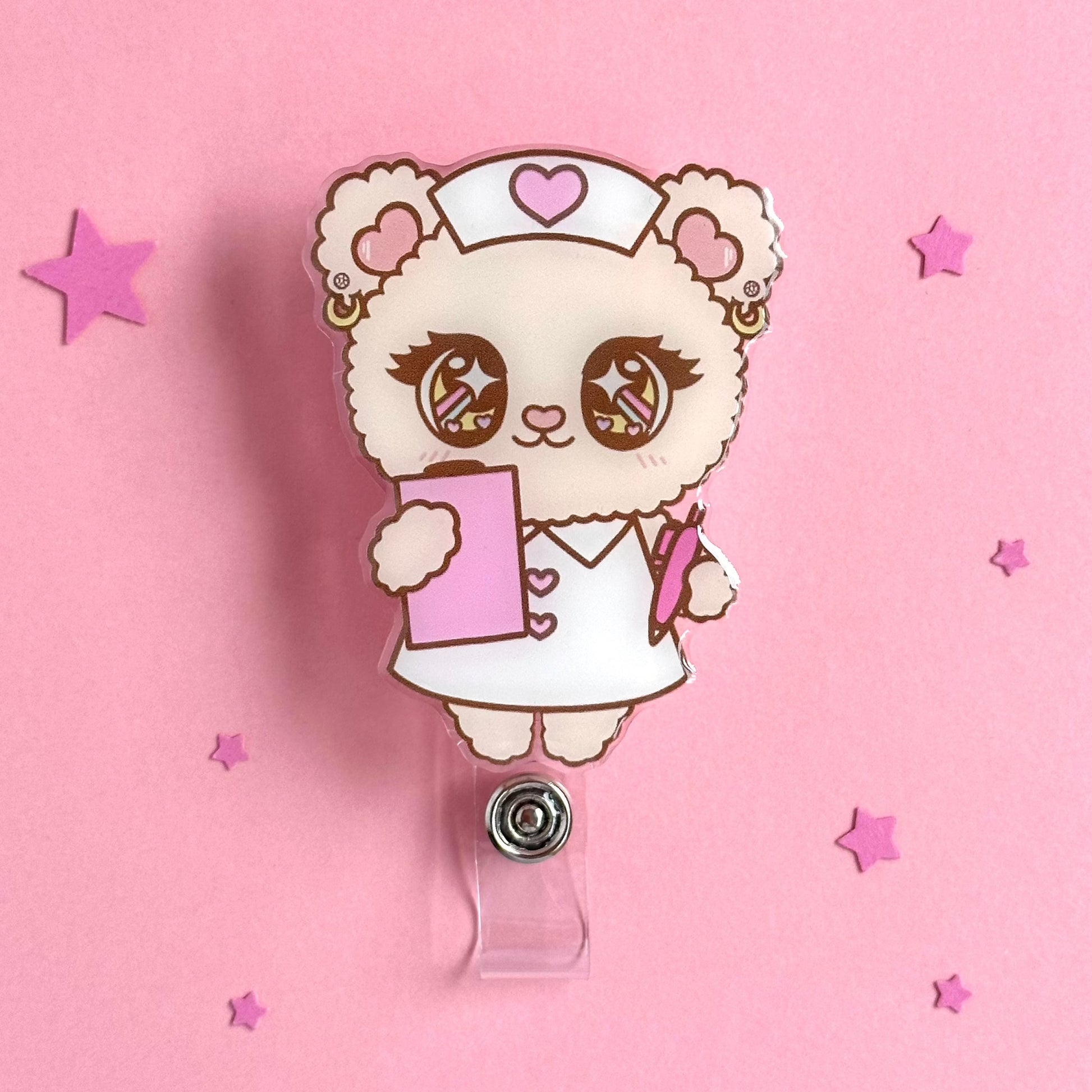 This stylish badge reel is perfect for adding a touch of whimsy to your work wardrobe. Easily attach to IDs and name tags, and securely keep them on hand when you need them. Make a stylish statement and keep your badge close with the Kawaii Nurse Vivi-Bear badge reel.